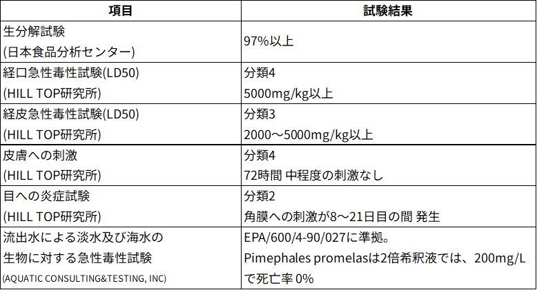 環境ホルモンや石油蒸留物を一切含まないので、下水・土壌・河川に流れても自然界の微生物によってすみやかに分解され、環境に残留しません。また毒性が極めて少ないので人体にも安心です。