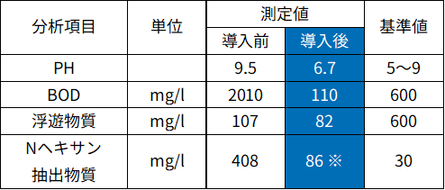 ※ 油水分離された油を、油吸着剤で処理することで、基準値30を達成しました!
