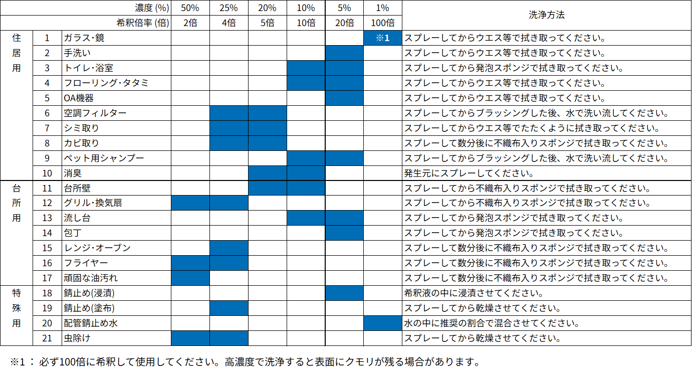 通常は5倍~100倍に薄めて使用します。詳しくは「用途別希釈表」をご確認ください。